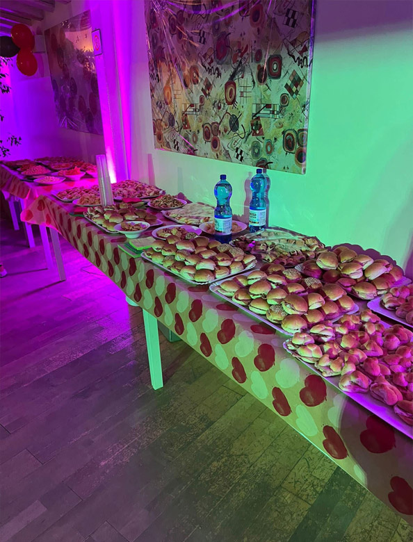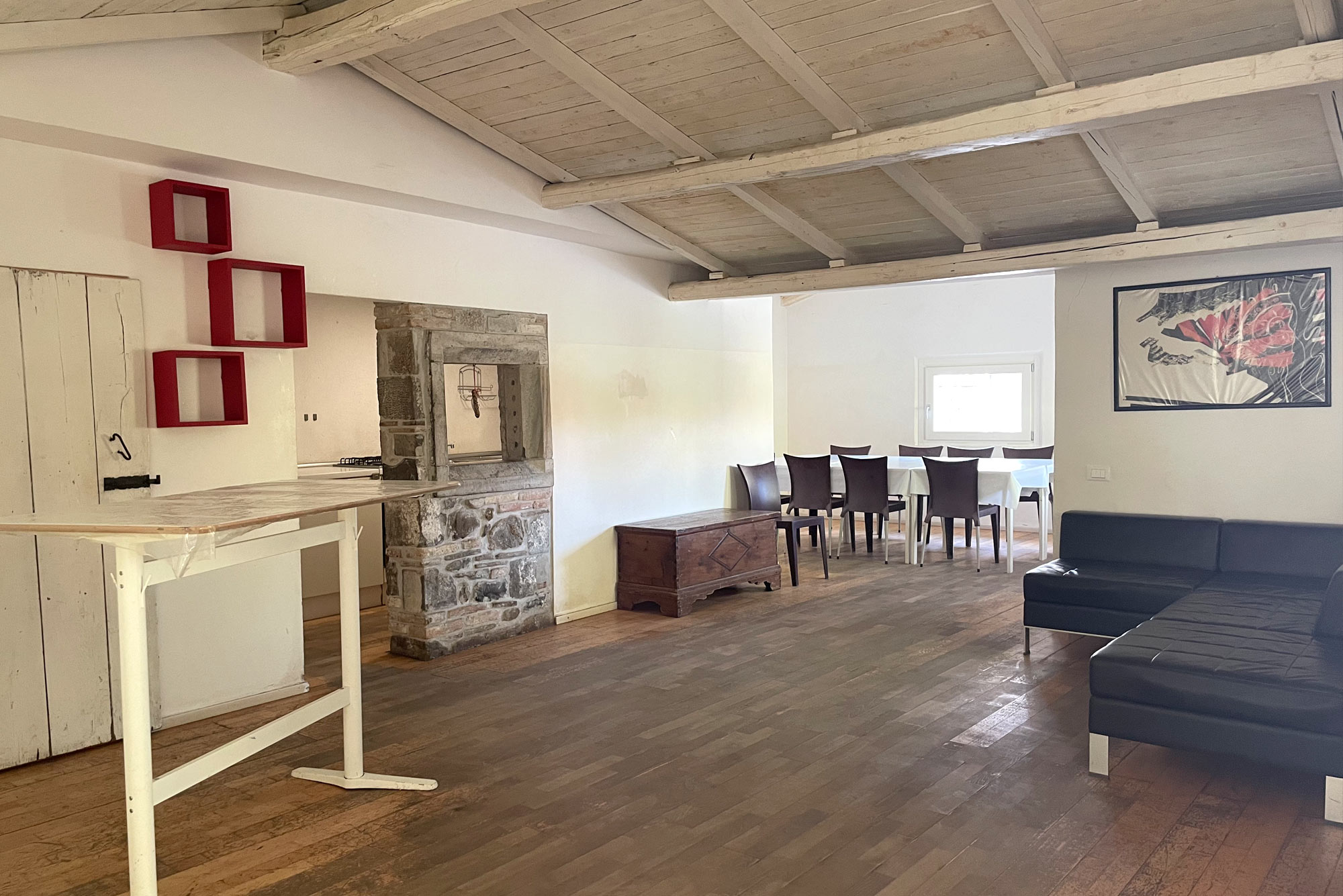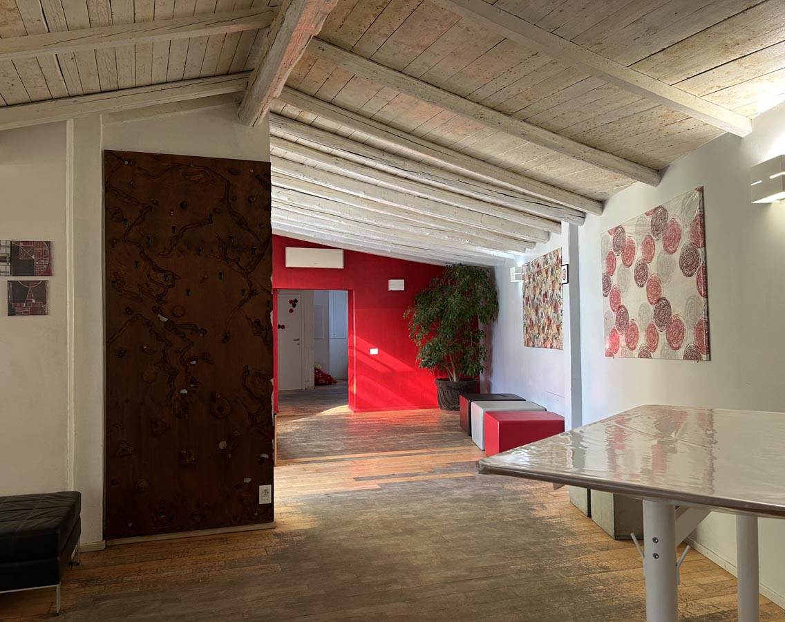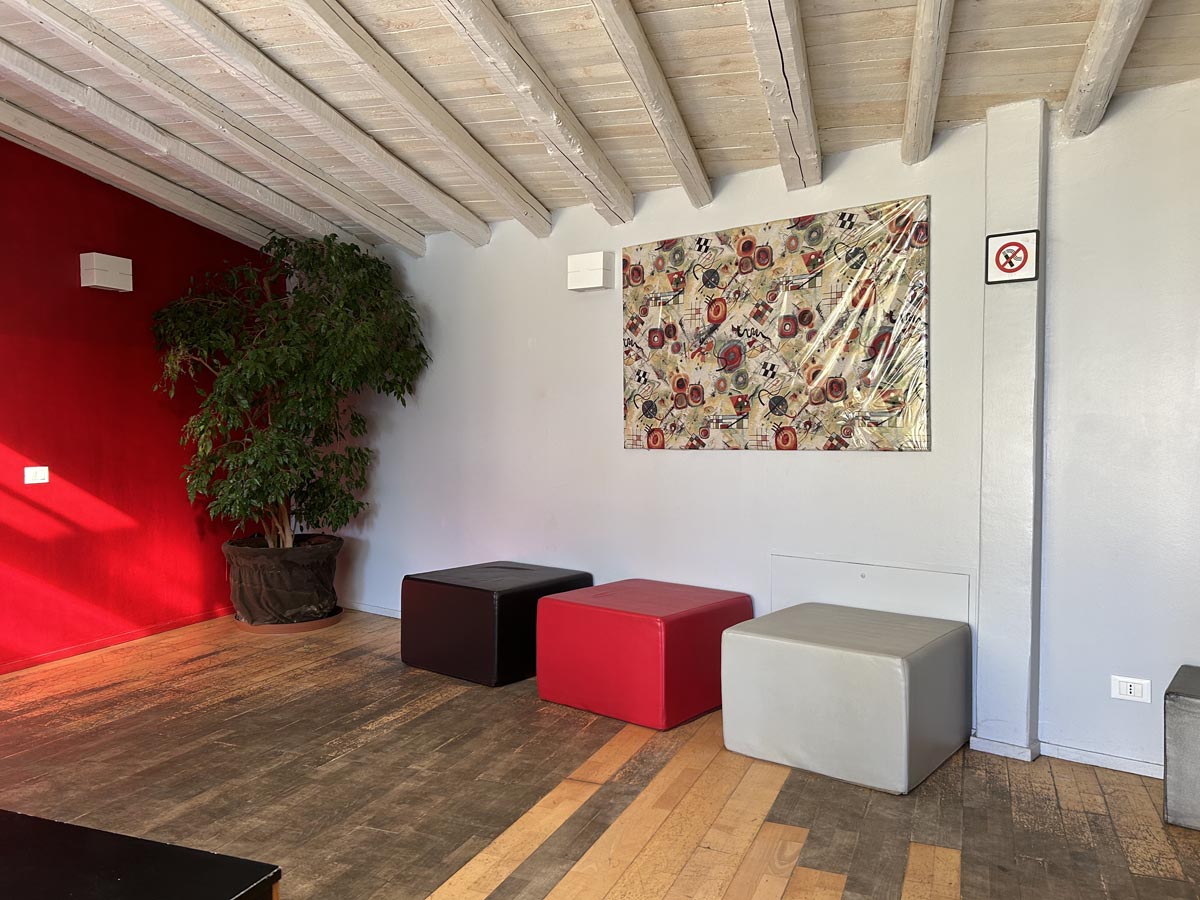 Troviamo tre pouf colorati grandi e due piccoli, un mobile basso, un armadio, un tavolino bar alto (misure L 130 cm. x P 70 cm.).