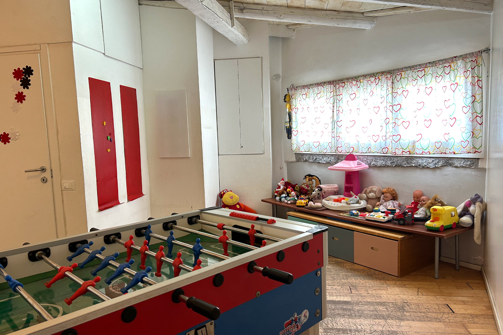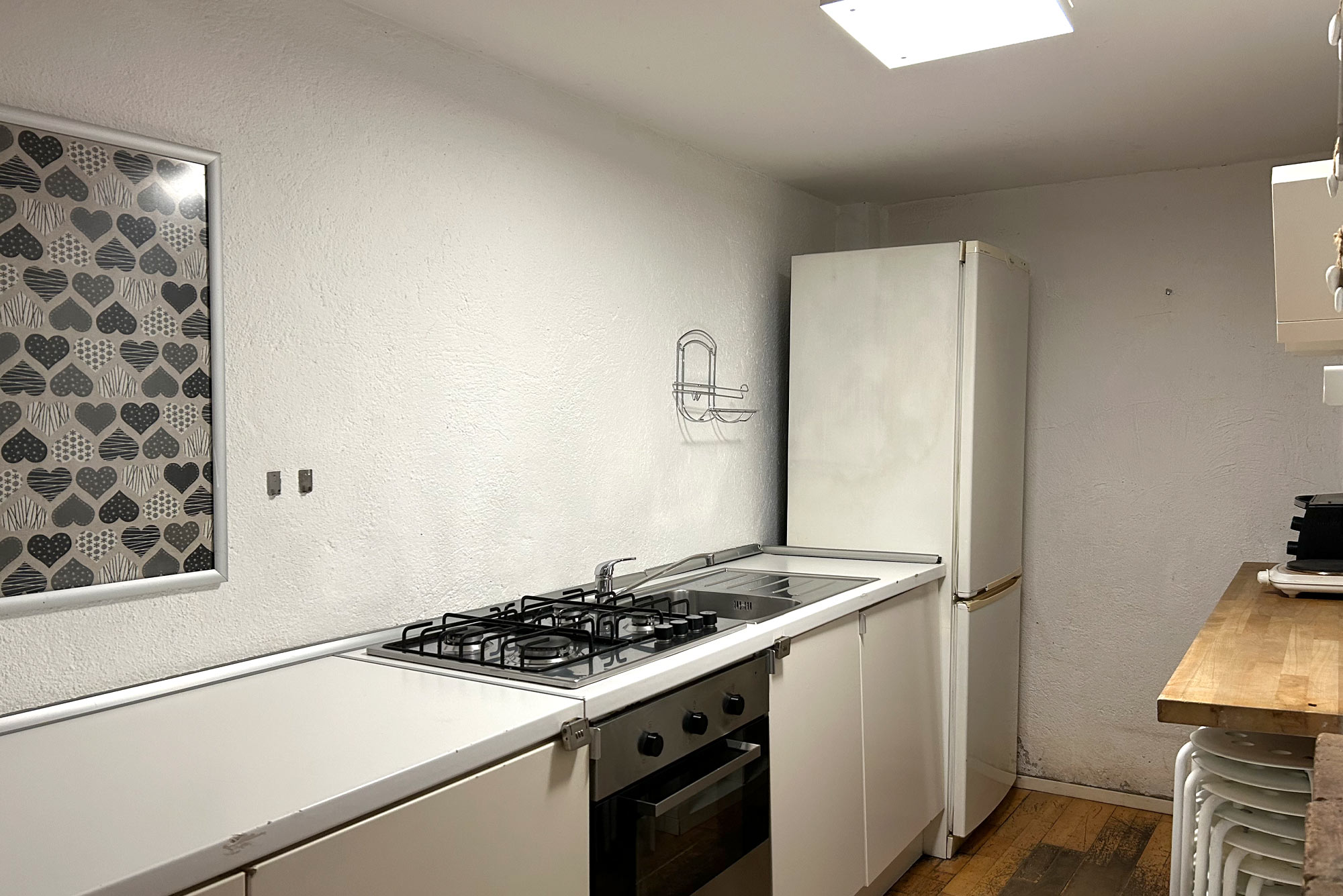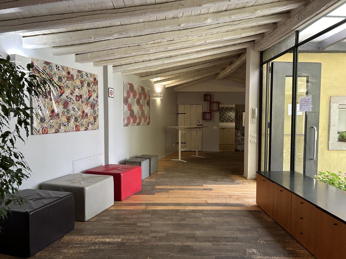 Troviamo tre pouf colorati grandi e due piccoli, un mobile basso, un armadio, un tavolino bar alto (misure L 130 cm. x P 70 cm.).
