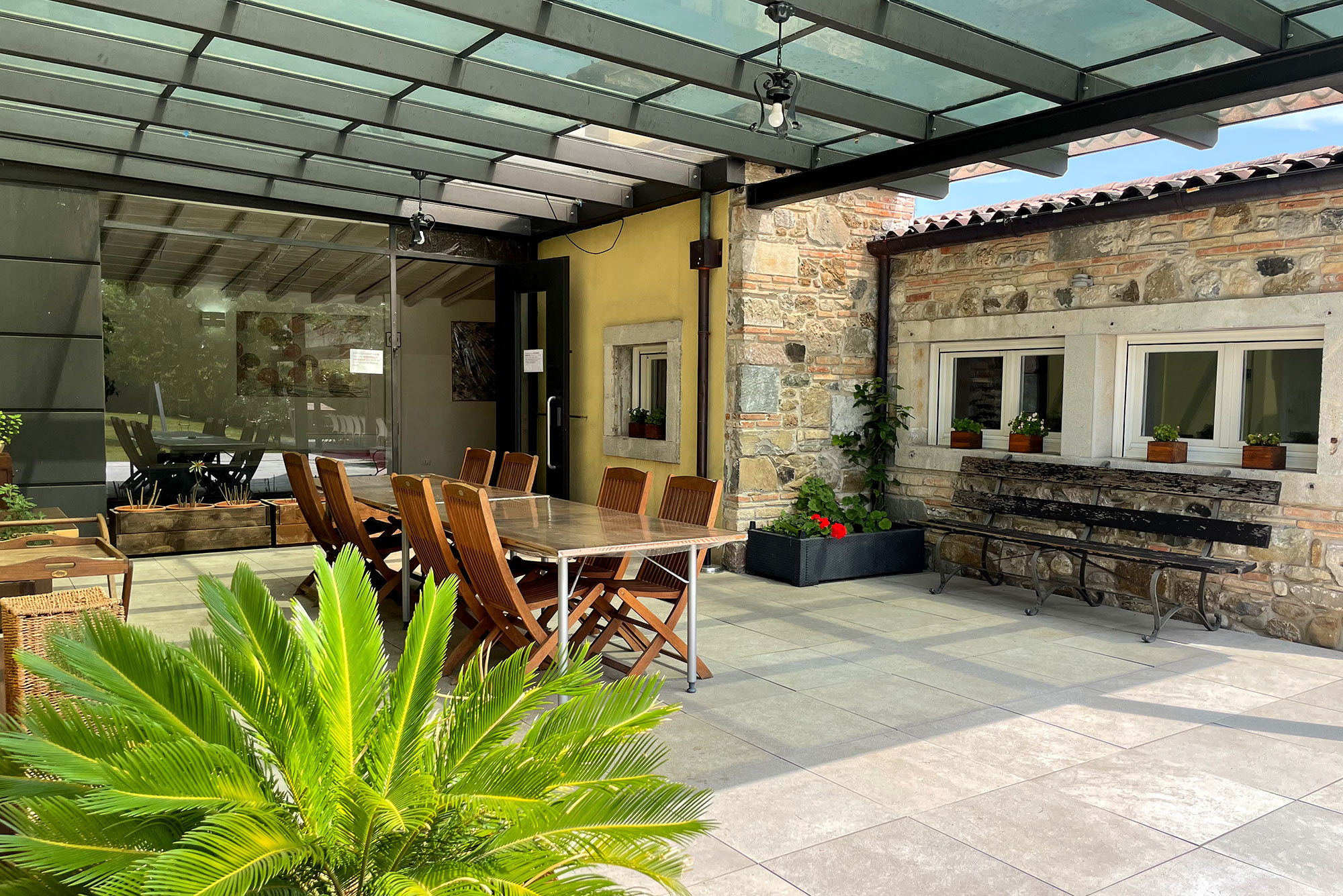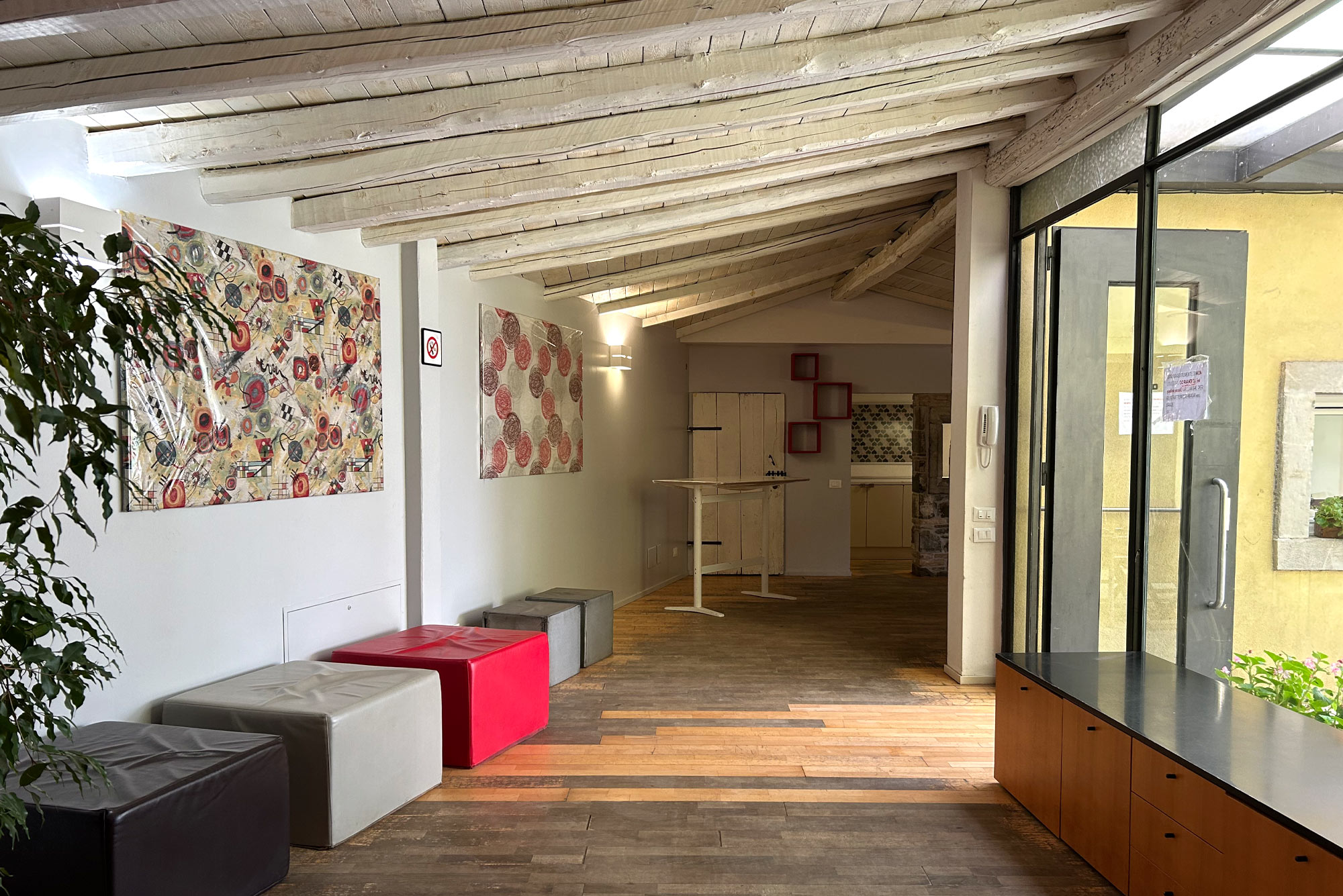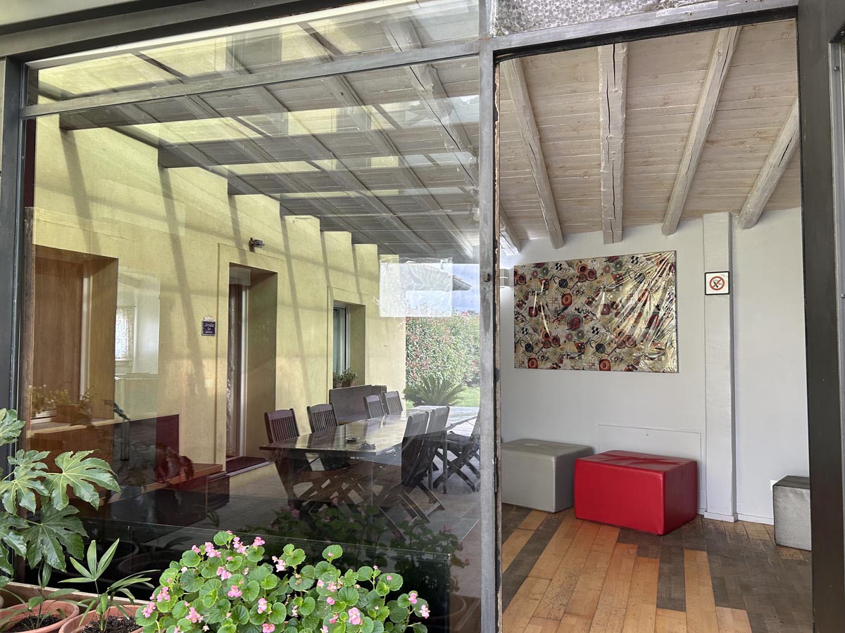L’ingresso è caratterizzato da una ampia vetrata che permette di dare agli spazi interni molta luminosità e che dall’interno offre la visione completa del giardino come un grande quadro verde.